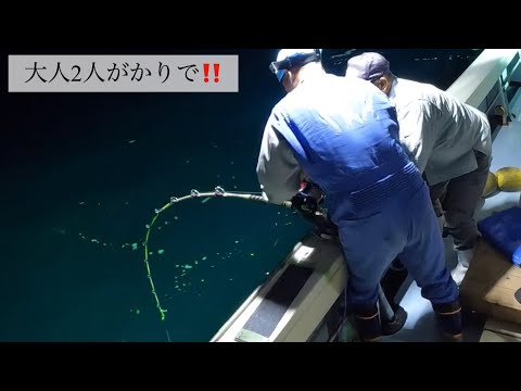 長崎沖でイカをエサにアラ(クエ)とカンパチを狙う泳がせ釣り。PE8号にフロロ60号、針20号、錘200号というヘビータックルで水深92m付近を攻める。